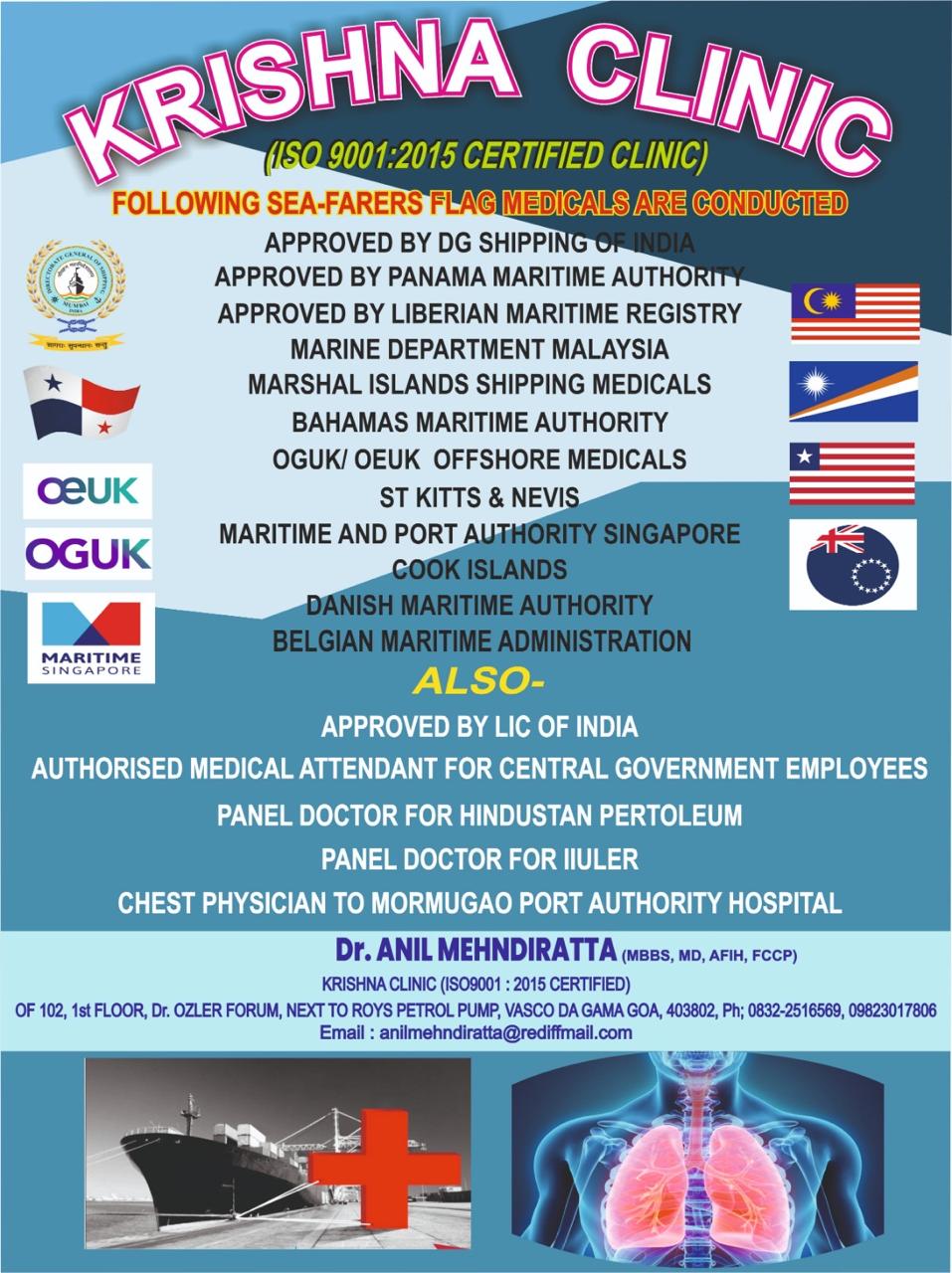 Krishna Clinic (Dr. Anil Mehndiratta) is the accredited, approved medical clinic in Goa for: